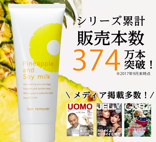 パイナップル豆乳脱毛クリームは、除毛しながらスキンケアが出来る新感覚クリームとして多くの人に選ばれている人気商品です。良い口コミや喜びの声がたくさんあり、シリーズ累計売上は388万本を突破しています。美肌のためにつくられた除毛クリームです。カミソリ負けや乾燥や埋もれ毛や色素沈着による黒ずみや毛穴の炎症などの剃ったり抜いたりする自己処理で生じる肌トラブルに悩まされているという人は多いのではないでしょうか。そんな人の悩みにしっかりと寄り添ってくれて肌トラブルの無い安心で安全なムダ毛処理を実現させて美肌に導いてくれるのがパイナップル豆乳脱毛クリームです。