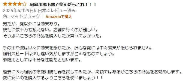 過去に中国メーカーの光脱毛を何度か買いましたが、広告とは違う性能でがっかりします。
